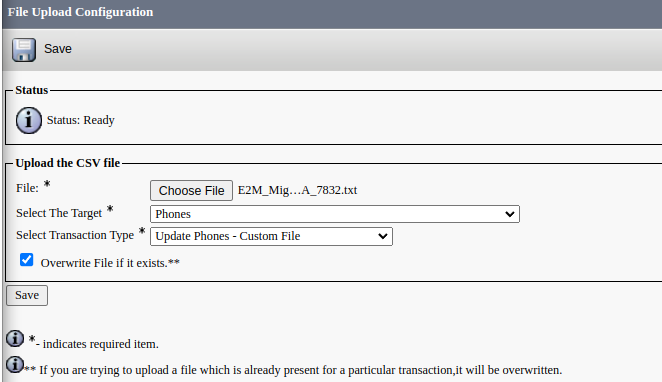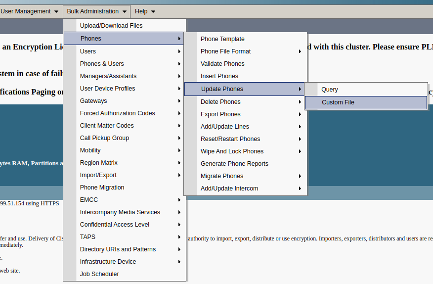 From Cisco Unified CM Administration, go to Bulk Administration -> Phones -> Update Phones -> Custom File